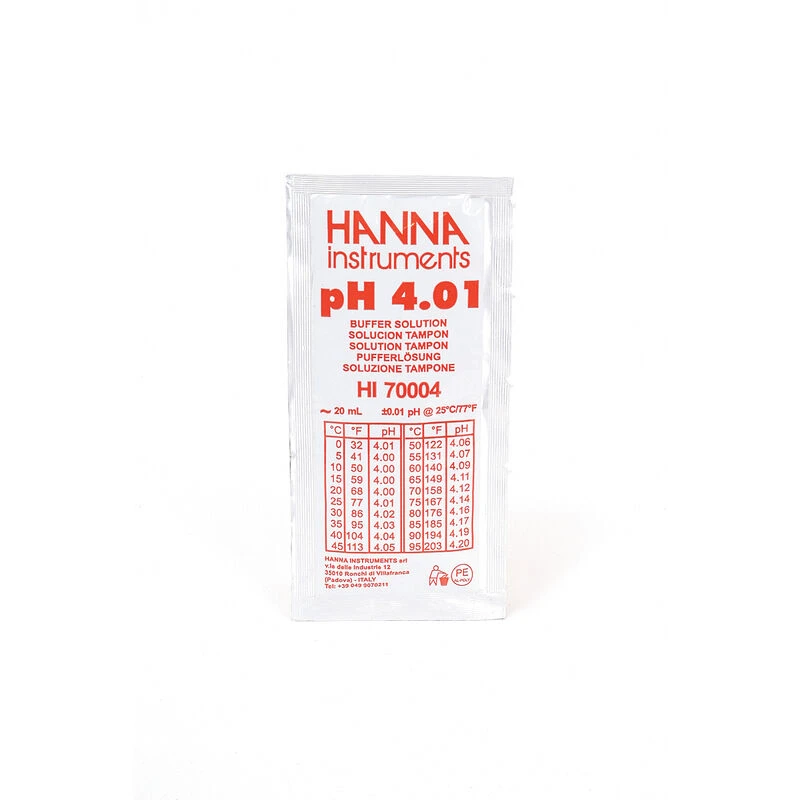 Use this 4.01 pH solution when calibrating the pH meter for measurements below 5.0 pH. Also use it with the 7.01 pH solution for a two point calibration which improves the accuracy. Includes five 20-ml sachets.