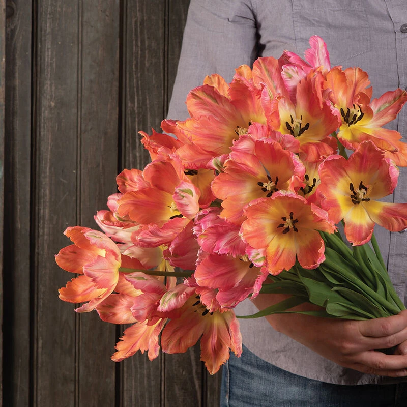 Beautiful peachy-pink tones with green and yellow on the outer petals. Pink tones increasingly develop as the blooms mature. Taller and more uniform than Salmon Parrot, with more deeply scalloped petals. In color, Apricot Parrot is more coral-pink than Salmon Parrot, which is a shade or two closer to orange-salmon. The 2–3″ blooms are very lightly fragrant. NOTE: Bulbs do not come pre-chilled; if growing in hardiness Zones 8–10, see growing information (below) for pre-chilling instructions.