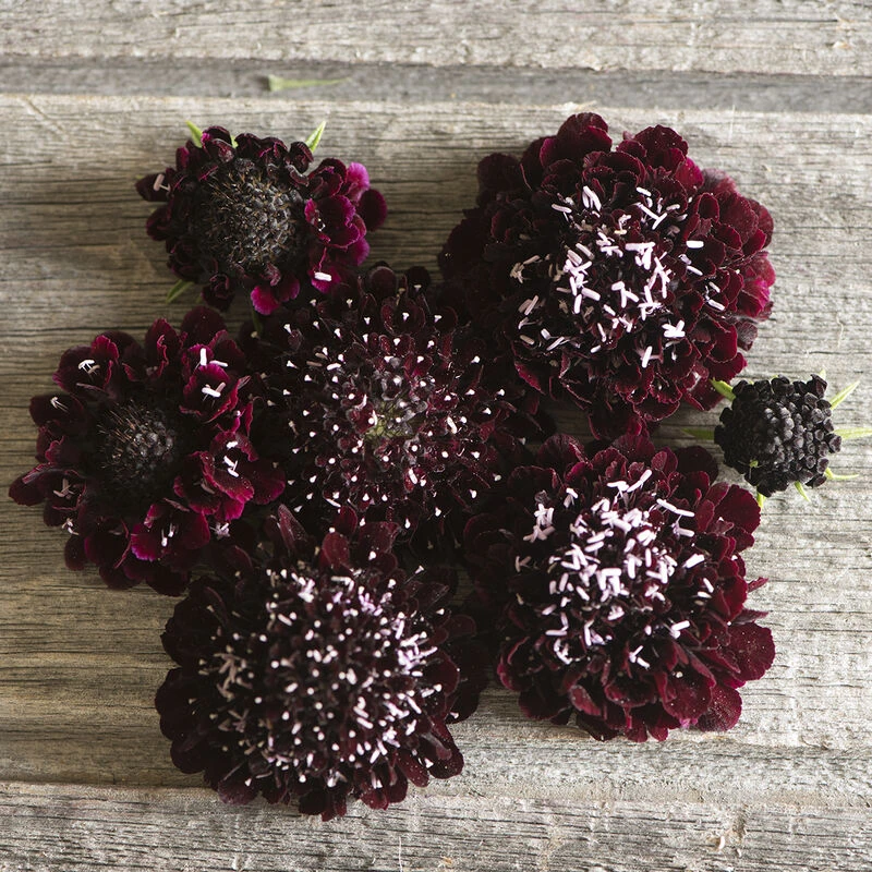 Almost black, 1 1/2–2 1/2″ blooms stand tall on strong, slender stems. A dramatic addition to any bouquet or garden. Also known as mourningbride.