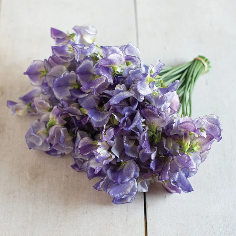 From the Spencer Series. Lavender blue streaks and flecks throughout and lining the slightly ruffled petal edge. Reminiscent of sea glass. Plants produce 3–4 blooms per 9–12″ stem. Mildly fragrant. NOTE: Spencer Series sweet peas are known as late-flowering because they require at least 12 hours of daylight, unlike more modern sweet pea varieties bred for winter production, which may require only 10–11 hours of daylight.
