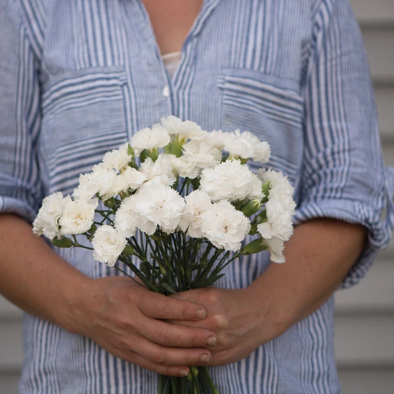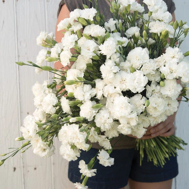 Vintage carnations present the sweet and spicy fragrance of clove. Frilly, pure white, 1 1/2–2″ double blooms with a small percentage of singles. Some blooms show a hint of pink. Grass-like, gray or blue-green foliage. Blooms late July through August in our trials and is best grown as an annual for cut-flower production. Chabaud is an old-fashioned type dating back to as early as 1904. D. caryophyllus is native to the Mediterranean, where emotional attachment to this flower first took root. Also known as annual carnation. Pronounced shab-o (with a long “o”) jeen dee-o’-niss. Tender perennial in Zones 6–8.