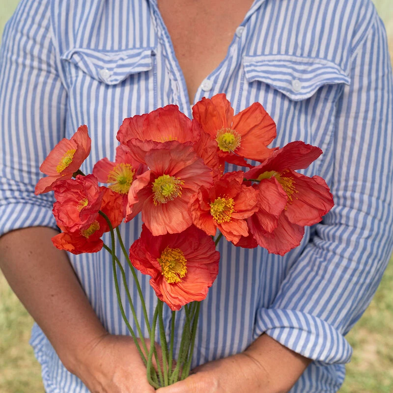 Watermelon-colored, 3–5″ blooms are borne on sturdy, straight, 12–20″ stems. Productive plants produce uniform, crinkled, cup-shaped blooms that sparkle and float above clumps of soft, gray-green foliage. Lightly fragrant.