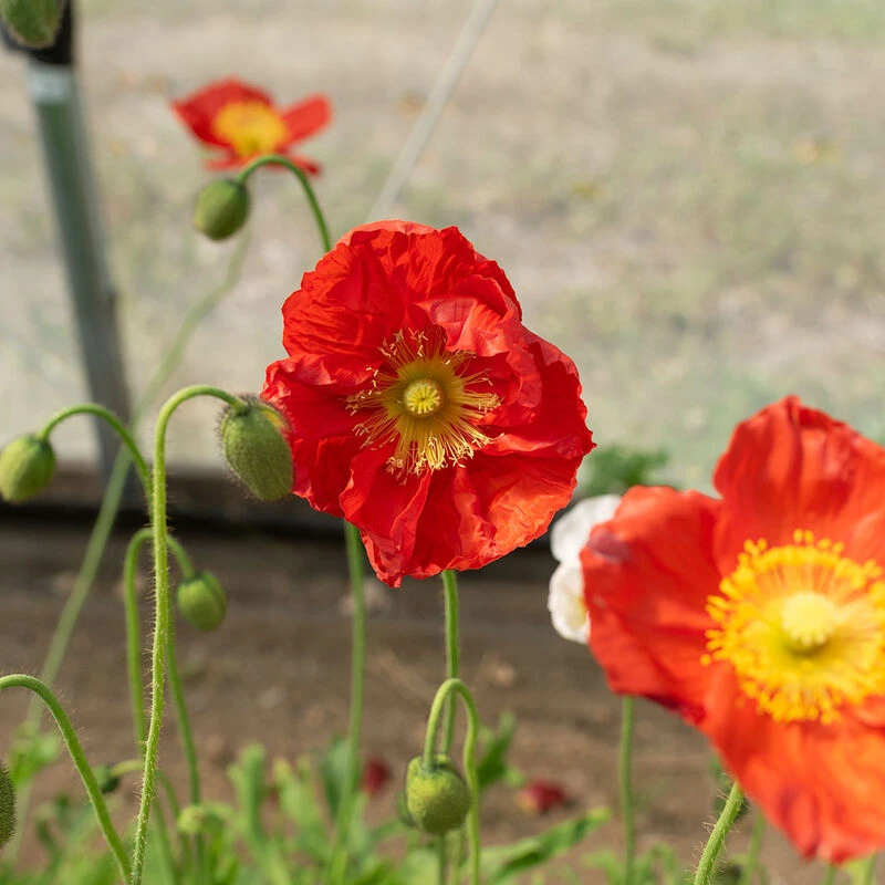 Cheerful scarlet-red, 3–5″ blooms are borne on sturdy, straight, 12–20″ stems. Productive plants produce uniform, crinkled, cup-shaped blooms that sparkle and float above clumps of soft, gray-green foliage. Lightly fragrant.