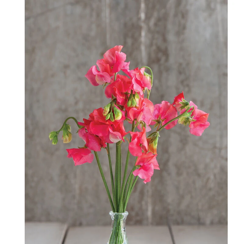 Coral-colored blooms. First and most abundant to bloom in our trials. Developed for flowering under short days, low light conditions, and in cool greenhouses. Suitable for spring or midwinter production. Long stems bear 3–5 blooms. Formerly called Winter Elegance. Can be spelled either as sweet pea or sweetpea.