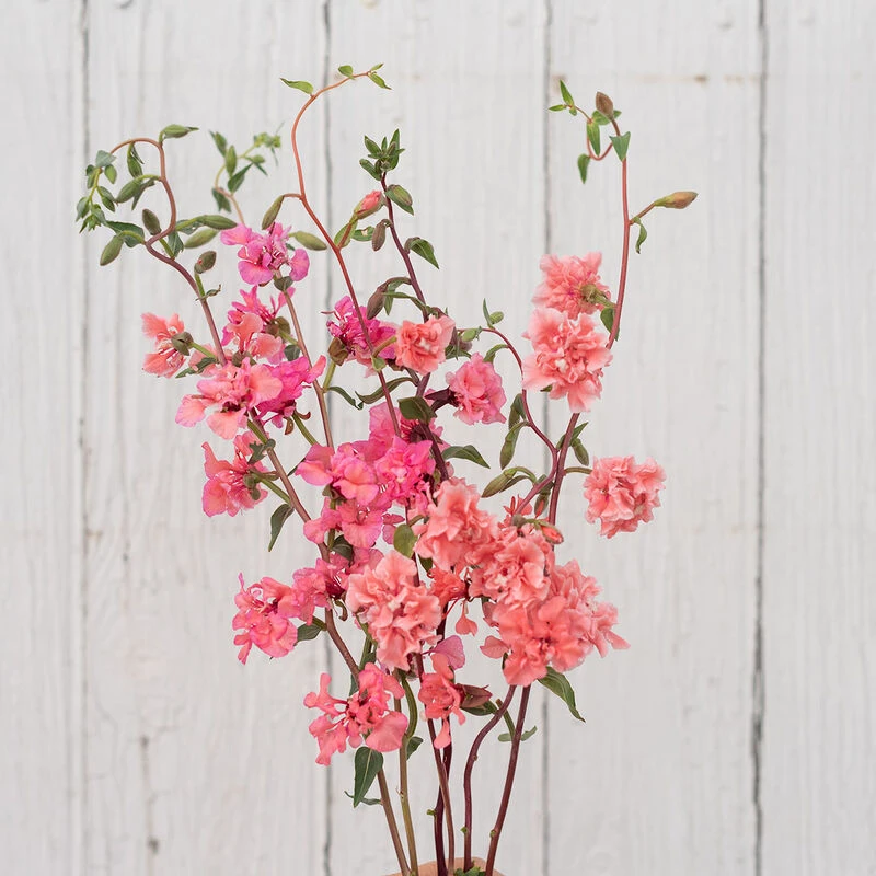 Beautiful salmon blooms strung along purple-red stems. Flowers bloom from the lower portion of the stem and continue to open up the stem. Mostly double, semidouble, and single blooms. Easy to harvest, as the hard (almost woody) stems are nearly free of foliage. Basal-branching plants. Native to the Western US. Also known as elegant clarkia and mountain garland.