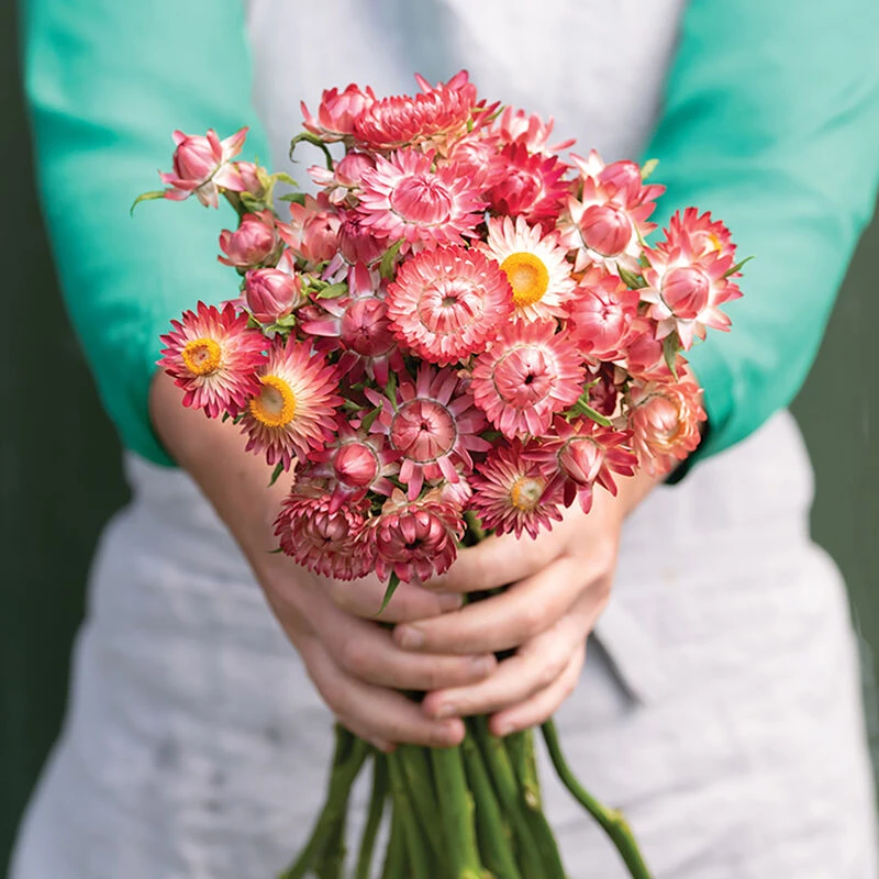 Tall, well-branched plants produce double flowers 1 1/2–2″ across. Blooms are slightly smaller, and plants are a few days later to bloom than the other colors in the King Size series. The creamy coral-and-raspberry color is worth the wait. Also known as bracted strawflower.