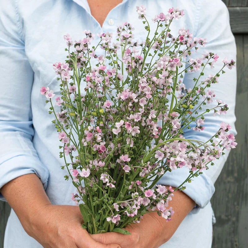 Tall, sturdy stems with delicate, pale pink flowers add a soft touch to mixed bouquets. Productive, healthy plants yield multiple cuts. Slightly later to bloom than blue Cynoglossum in our field trials. Overwinters well in our unheated tunnel trials, producing multiple cuts. Attracts bees. Also known as Chinese hound’s tongue.