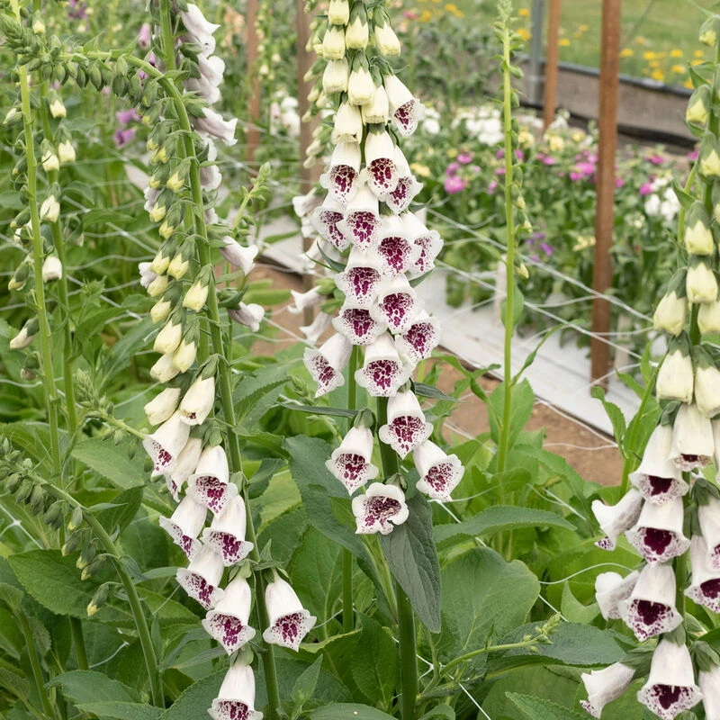 Second-year flowering. White bells with dark plum-colored throats and freckles. Bells form on one side of the stem. A nice complement to Sugar Plum digitalis. In our trials, Pam’s Choice produced 3–5 tall stems and 2–3 shorter, secondary stems per plant. Can be fall or spring-planted. NOTE: Flowering occurs in late spring in the second season of growth.