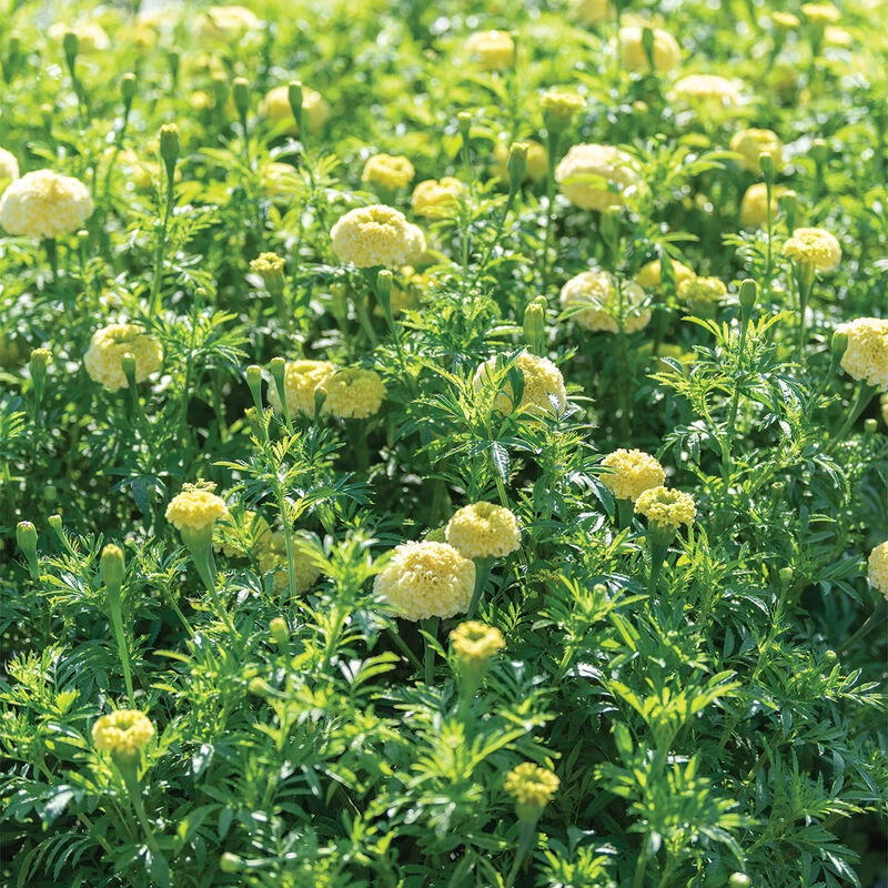 2–3″ cream to pale yellow-colored, fully double, uniform blooms borne on productive, sturdy, uniform plants. High-quality blooms produce a mild, sweet, marshmallow fragrance, without the typical strong marigold scent. More compact plants than those from the Giant and Cocoâ„¢ Series. White Swan is significantly taller and higher quality than all other cream-colored marigolds in our trials. Also known as African marigold, American marigold, and Aztec marigold.